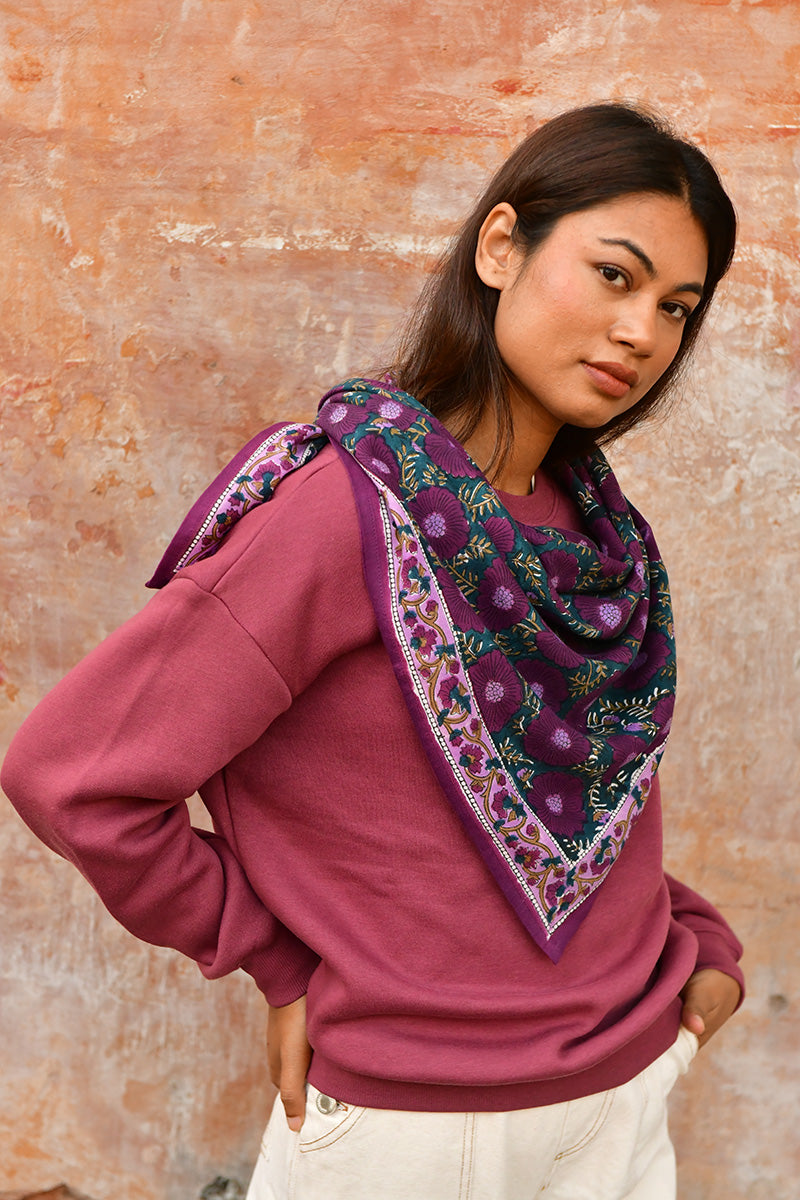 🖐️ Grand foulard imprimé artisanalement dans un atelier du nord de l'Inde, au Rajasthan. L'impression se fait selon le savoir-faire traditionnel de l’impression au block print, avec des tampons de bois taillés et sculptés à la main, trempés dans des encres d’origine végétale et apposés manuellement sur le tissu, en plusieurs couches, avec une maîtrise époustouflante. Des irrégularités d’impression et des nuances de couleurs sont visibles et reflètent la beauté de ce travail artisanal traditionnel. Chaque pièce est donc unique !