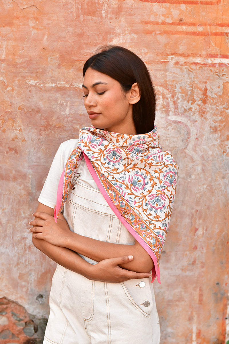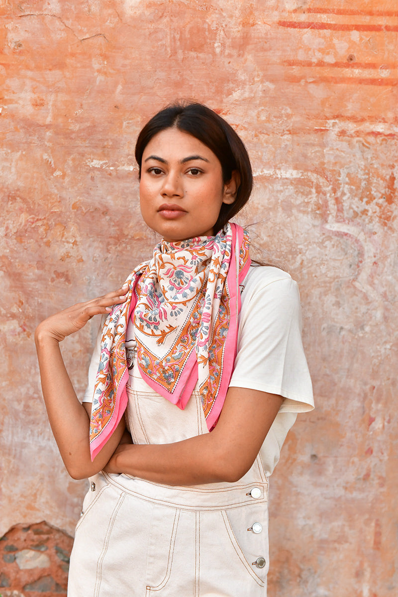 🖐️ Grand foulard imprimé artisanalement dans un atelier du nord de l'Inde, au Rajasthan. L'impression se fait selon le savoir-faire traditionnel de l’impression au block print, avec des tampons de bois taillés et sculptés à la main, trempés dans des encres d’origine végétale et apposés manuellement sur le tissu, en plusieurs couches, avec une maîtrise époustouflante. Des irrégularités d’impression et des nuances de couleurs sont visibles et reflètent la beauté de ce travail artisanal traditionnel. Chaque pièce est donc unique !