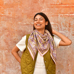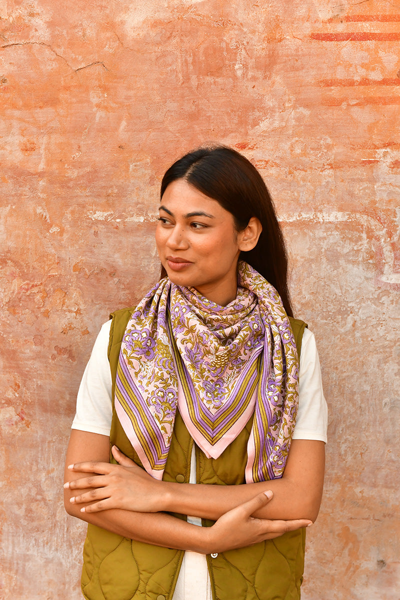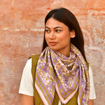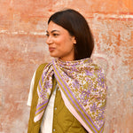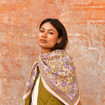 Avec un motif classique fleuri teinté de rose pâle, de vert et de violet lilas, le grand foulard Constantine Rose possède aussi une touche moderne grâce à sa bordure rayée.