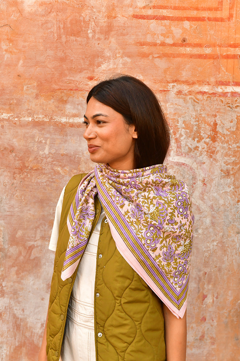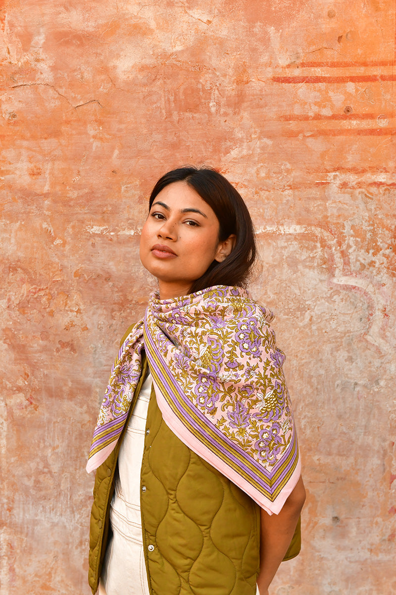 🖐️ Grand foulard imprimé artisanalement dans un atelier du nord de l'Inde, au Rajasthan. L'impression se fait selon le savoir-faire traditionnel de l’impression au block print, avec des tampons de bois taillés et sculptés à la main, trempés dans des encres d’origine végétale et apposés manuellement sur le tissu, en plusieurs couches, avec une maîtrise époustouflante. Des irrégularités d’impression et des nuances de couleurs sont visibles et reflètent la beauté de ce travail artisanal traditionnel. Chaque pièce est donc unique !