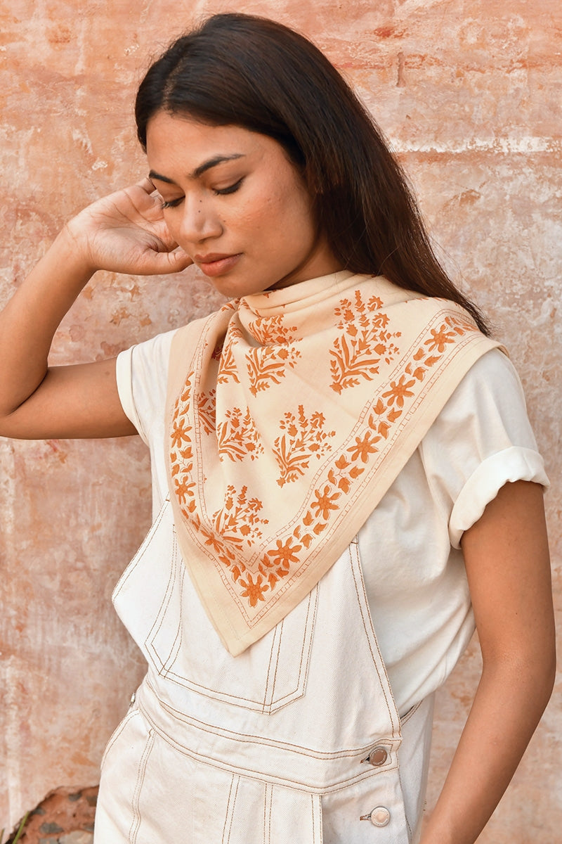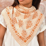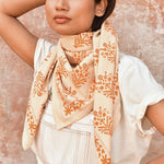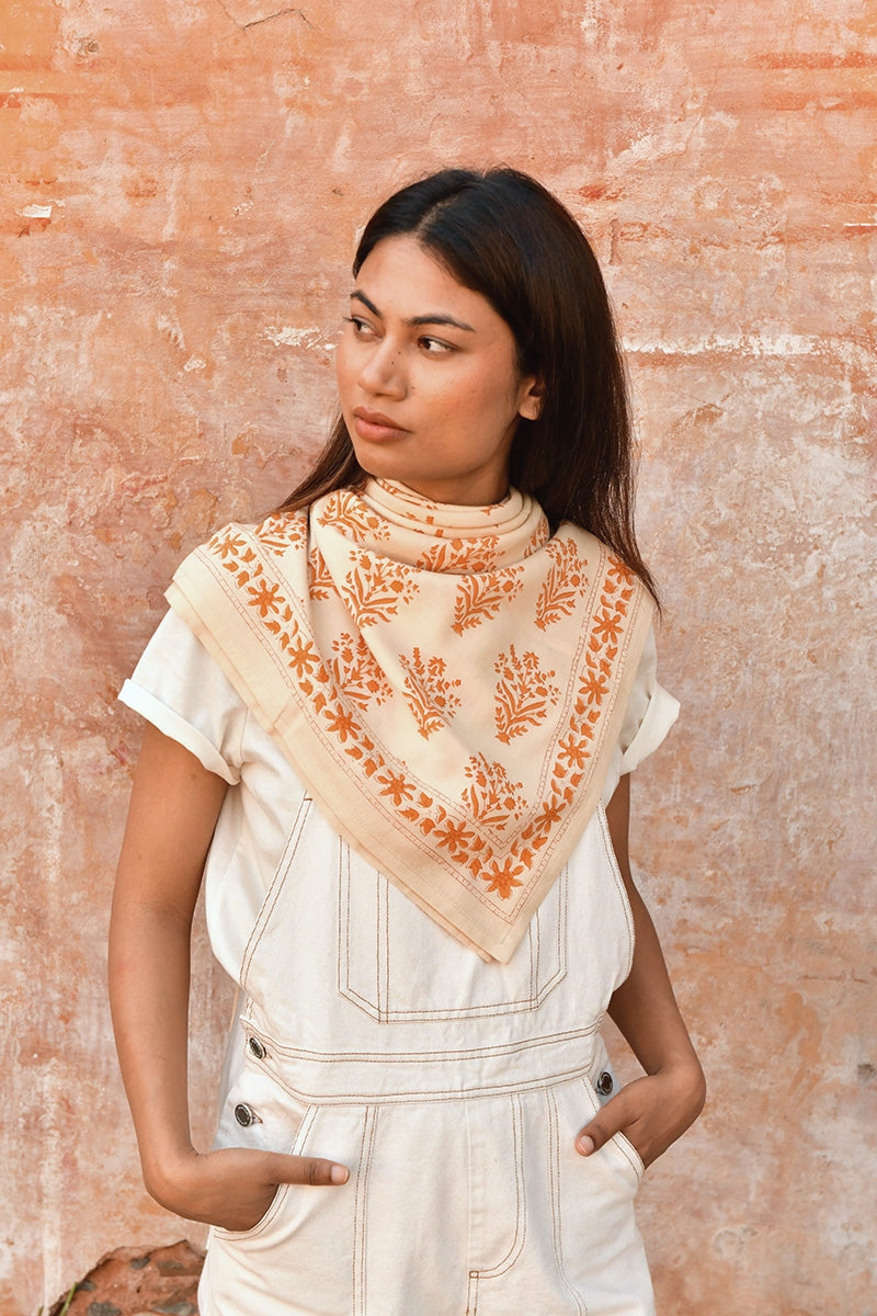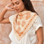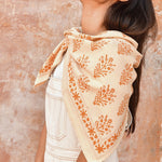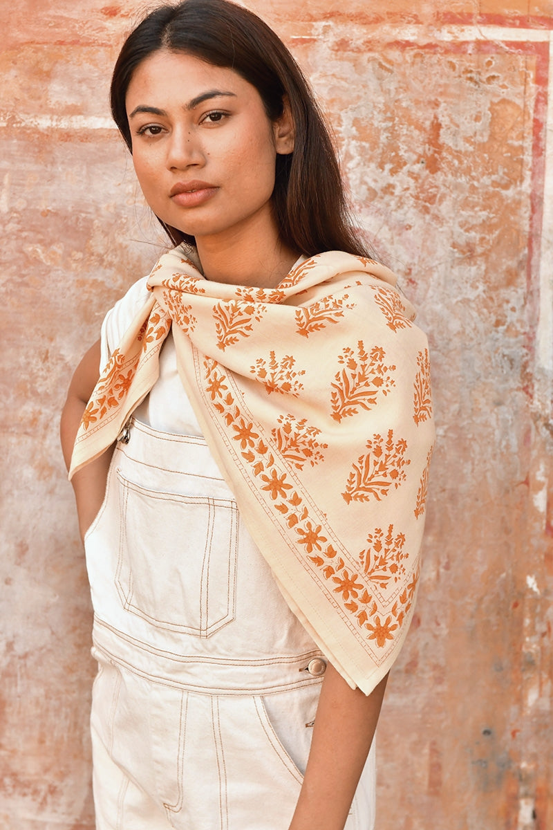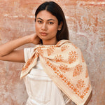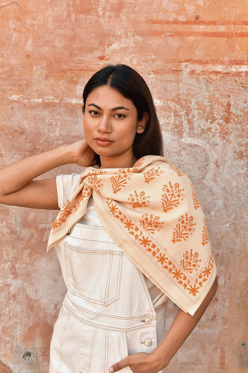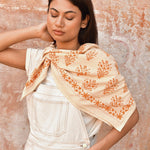 Sobre et facile à porter, le grand foulard indien Galatie Dune arbore des coloris clairs et doux : un fond crème et de grandes fleurs orangées. Chez byzantine, ce modèle phare se décline dans plusieurs coloris.