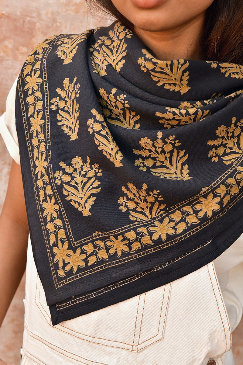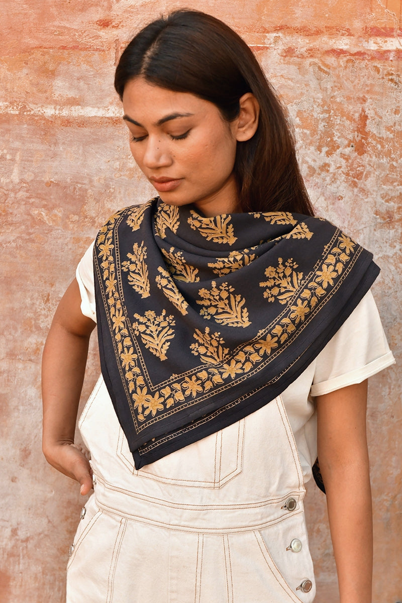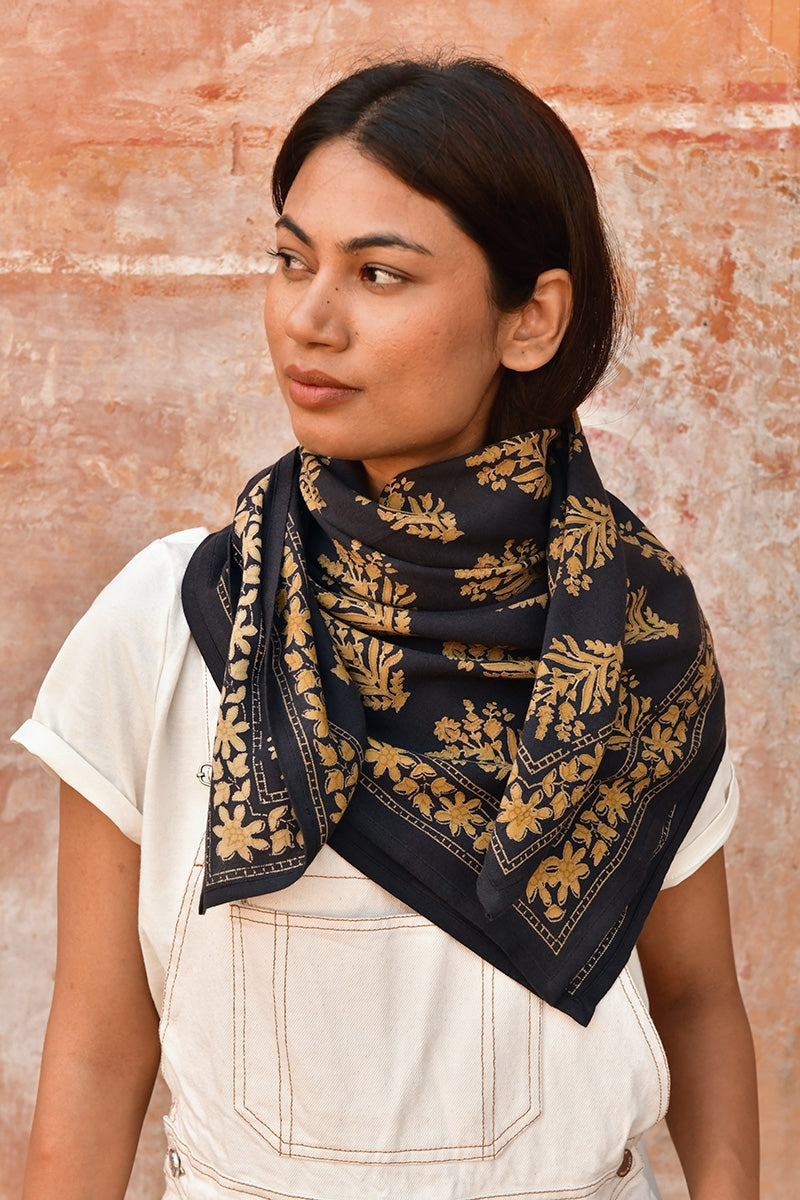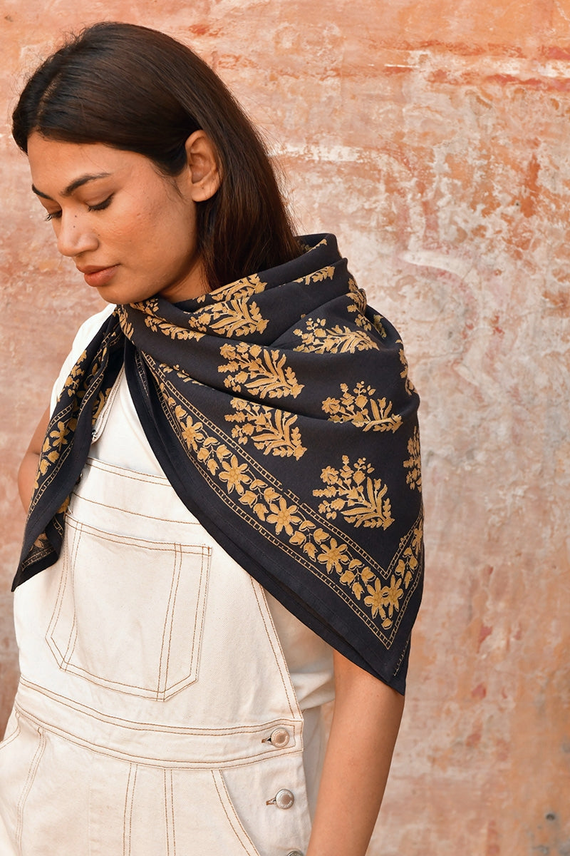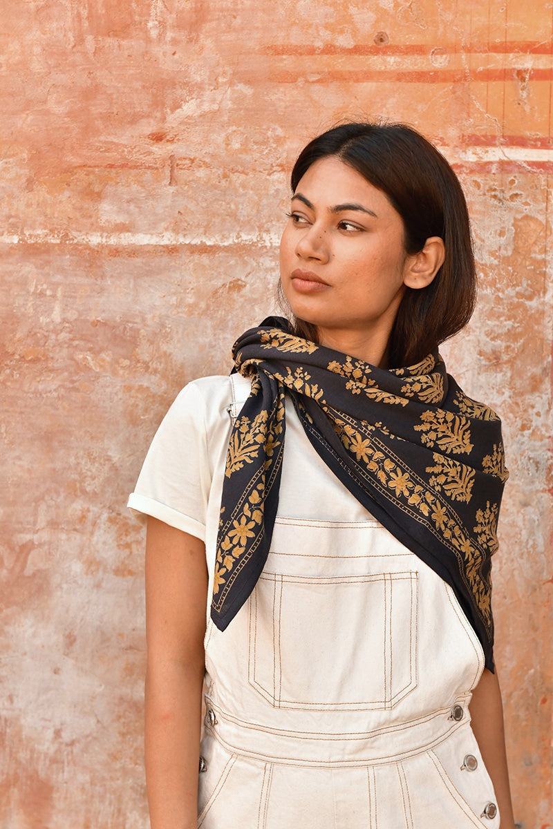 🖐️ Grand foulard imprimé artisanalement dans un atelier du nord de l'Inde, au Rajasthan. L'impression se fait selon le savoir-faire traditionnel de l’impression au block print, avec des tampons de bois taillés et sculptés à la main, trempés dans des encres d’origine végétale et apposés manuellement sur le tissu, en plusieurs couches, avec une maîtrise époustouflante. Des irrégularités d’impression et des nuances de couleurs sont visibles et reflètent la beauté de ce travail artisanal traditionnel. Chaque pièce est donc unique !
