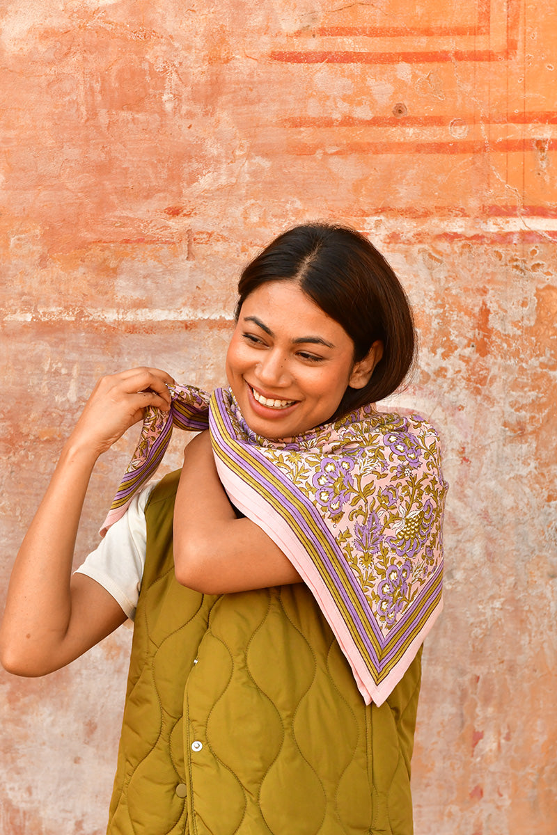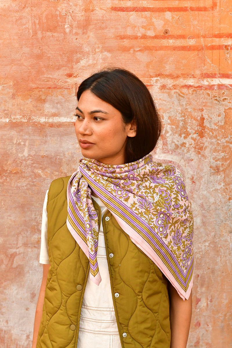 🖐️ Grand foulard imprimé artisanalement dans un atelier du nord de l'Inde, au Rajasthan. L'impression se fait selon le savoir-faire traditionnel de l’impression au block print, avec des tampons de bois taillés et sculptés à la main, trempés dans des encres d’origine végétale et apposés manuellement sur le tissu, en plusieurs couches, avec une maîtrise époustouflante. Des irrégularités d’impression et des nuances de couleurs sont visibles et reflètent la beauté de ce travail artisanal traditionnel. Chaque pièce est donc unique !