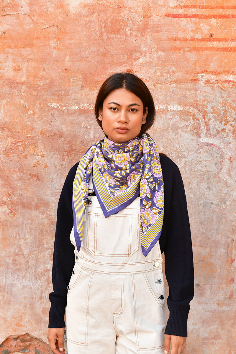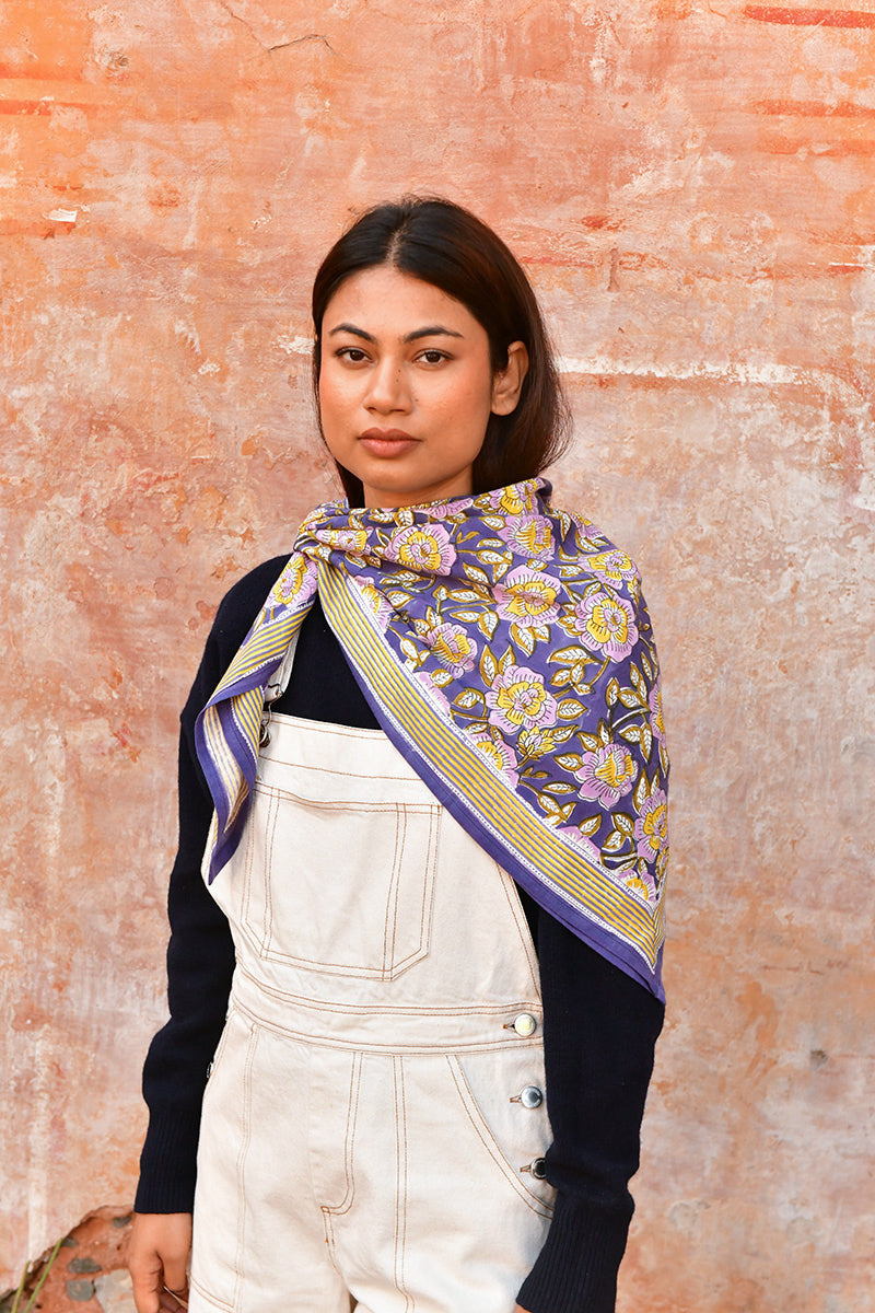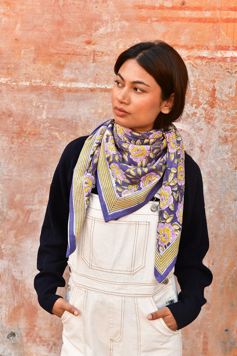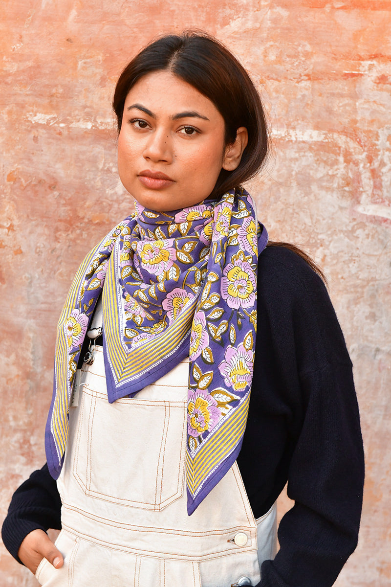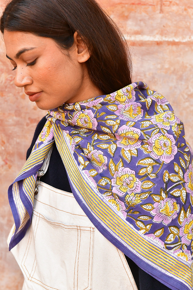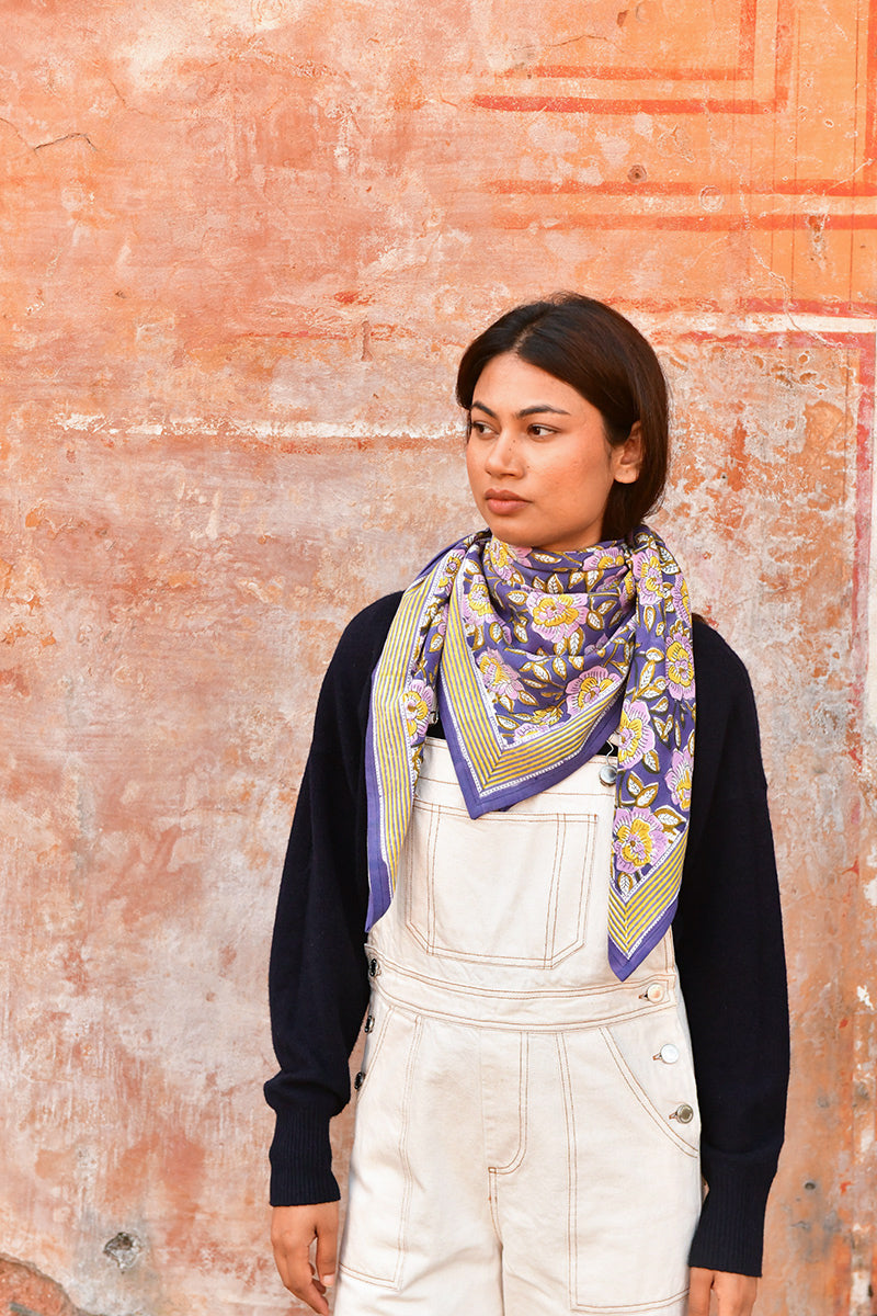 🖐️ Grand foulard imprimé artisanalement dans un atelier du nord de l'Inde, au Rajasthan. L'impression se fait selon le savoir-faire traditionnel de l’impression au block print, avec des tampons de bois taillés et sculptés à la main, trempés dans des encres d’origine végétale et apposés manuellement sur le tissu, en plusieurs couches, avec une maîtrise époustouflante. Des irrégularités d’impression et des nuances de couleurs sont visibles et reflètent la beauté de ce travail artisanal traditionnel. Chaque pièce est donc unique !