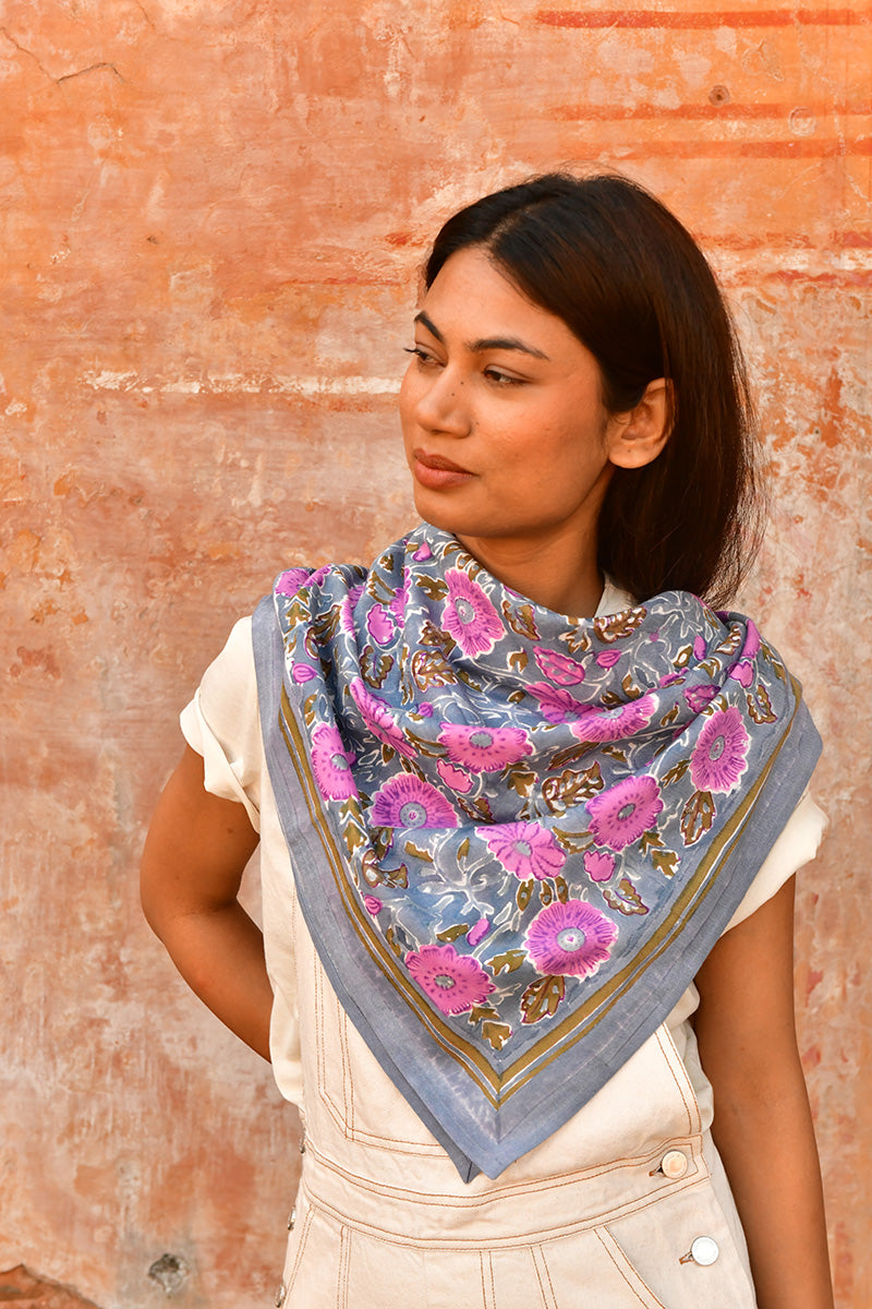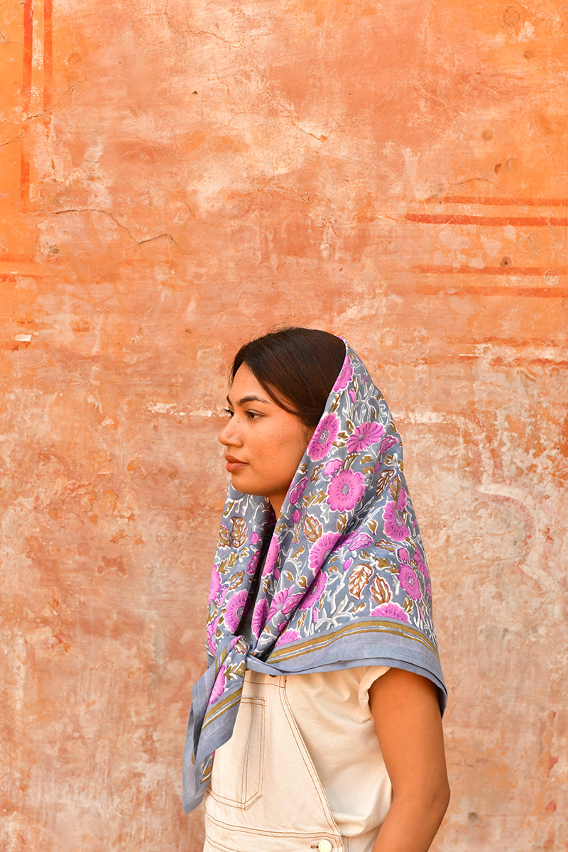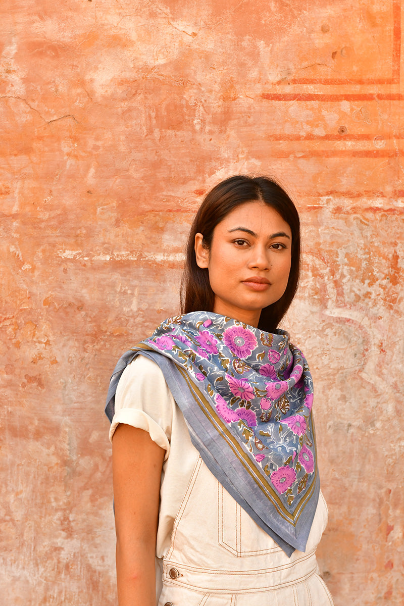 🖐️ Grand foulard imprimé artisanalement dans un atelier du nord de l'Inde, au Rajasthan. L'impression se fait selon le savoir-faire traditionnel de l’impression au block print, avec des tampons de bois taillés et sculptés à la main, trempés dans des encres d’origine végétale et apposés manuellement sur le tissu, en plusieurs couches, avec une maîtrise époustouflante. Des irrégularités d’impression et des nuances de couleurs sont visibles et reflètent la beauté de ce travail artisanal traditionnel. Chaque pièce est donc unique !