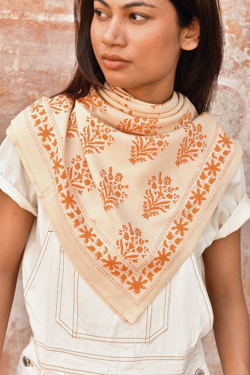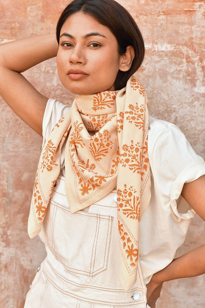 Sobre et facile à porter, le grand foulard indien Galatie Dune arbore des coloris clairs et doux : un fond crème et de grandes fleurs orangées. Chez byzantine, ce modèle phare se décline dans plusieurs coloris.