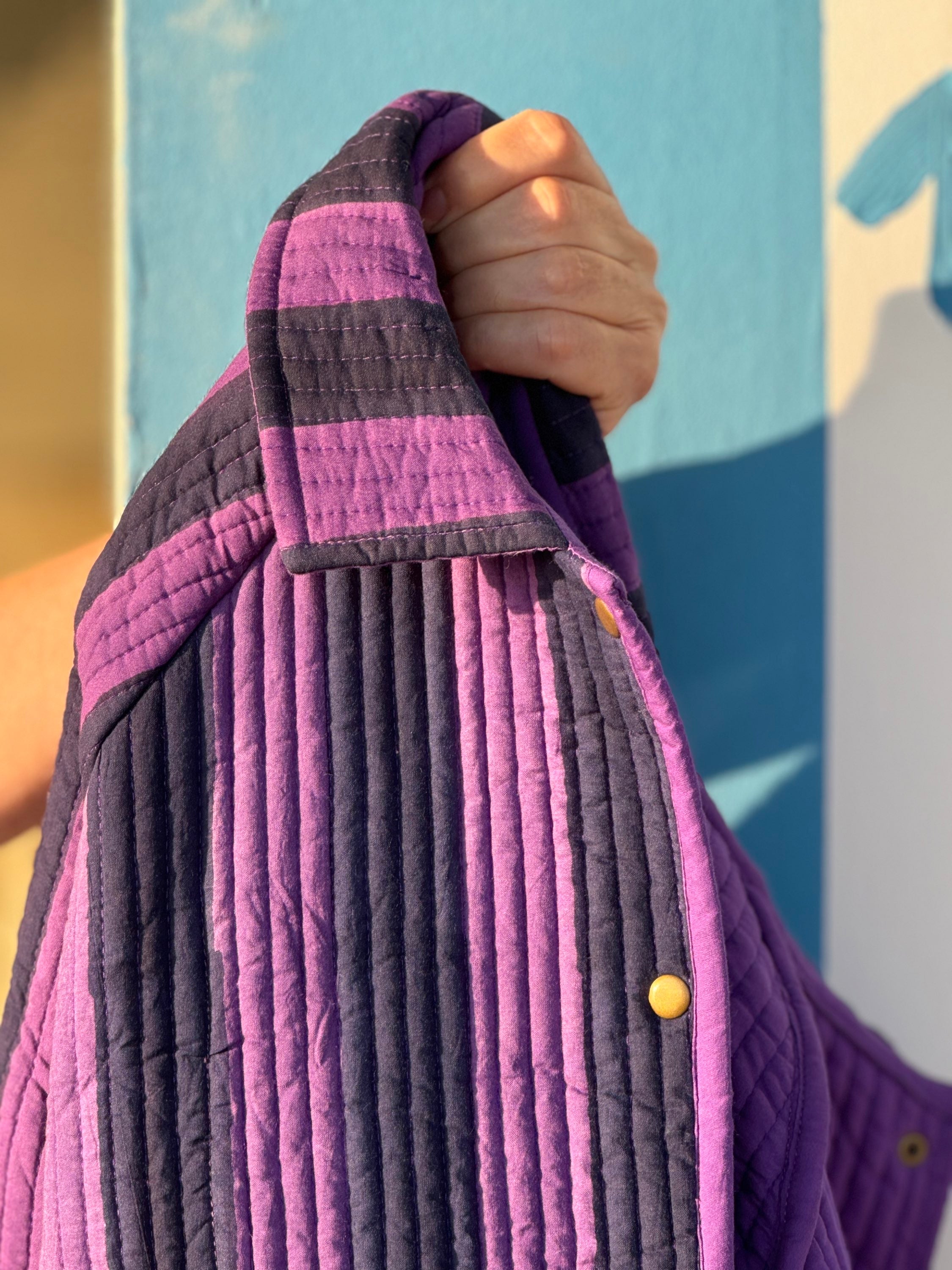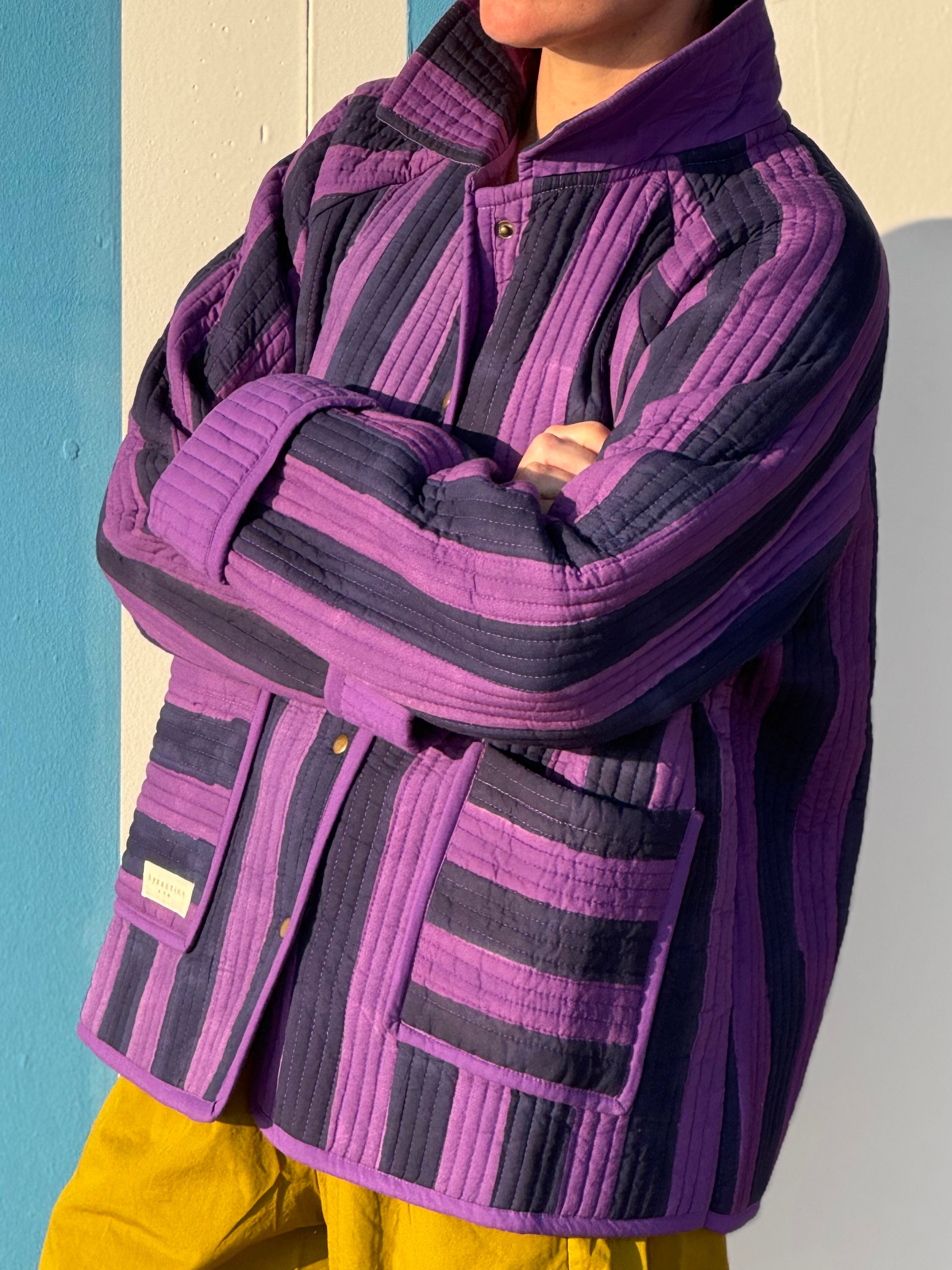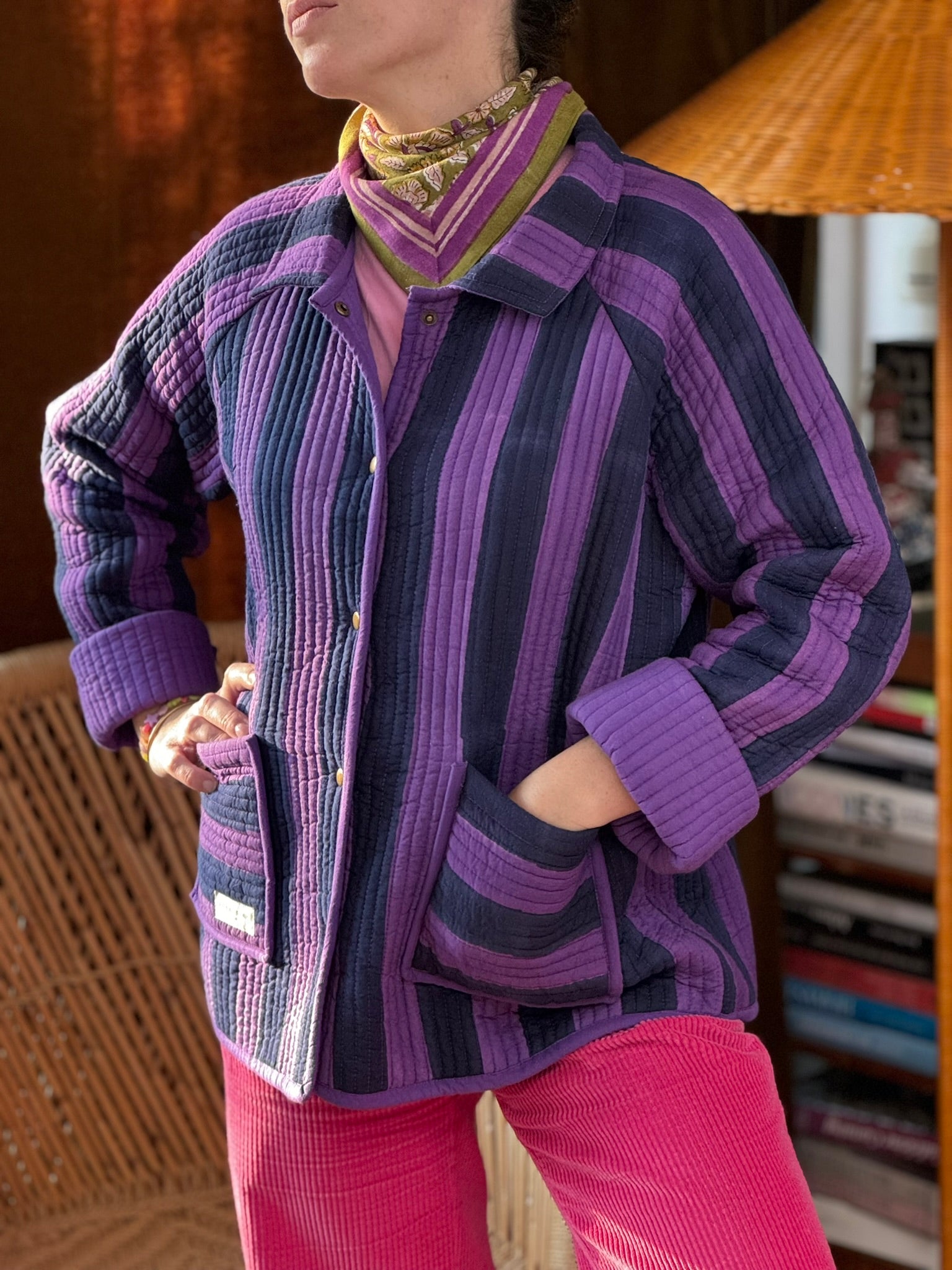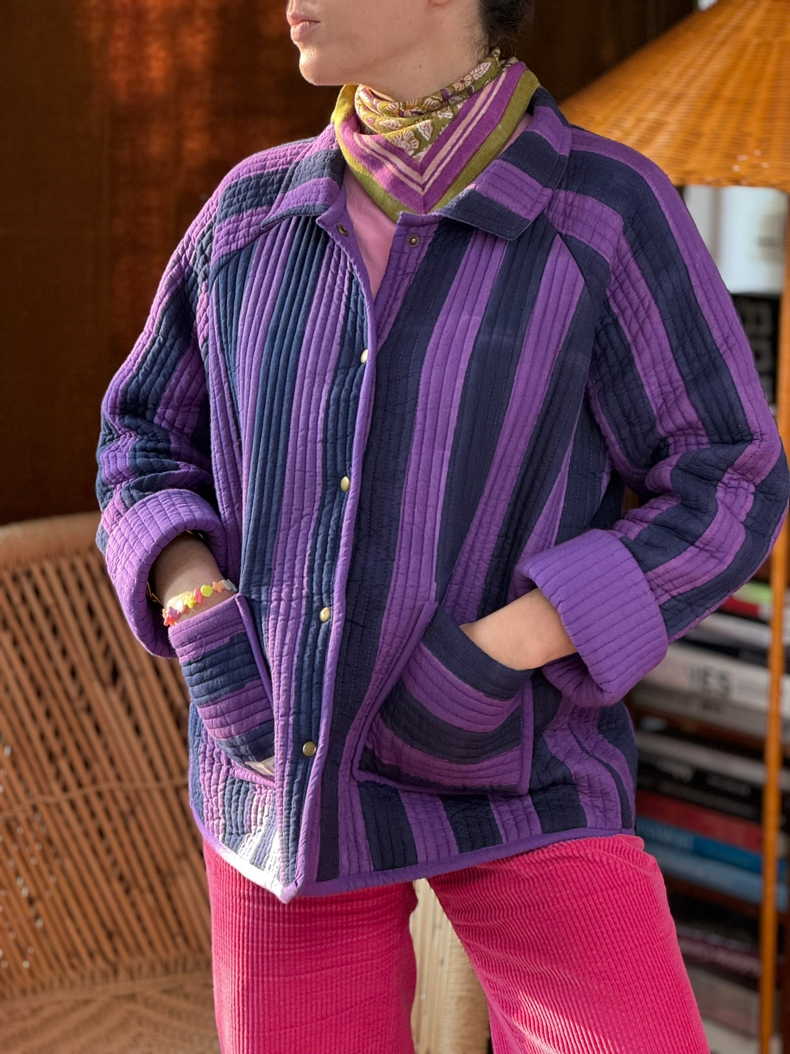 Découvrez notre veste matelassée en blockprint à grosses rayures, une pièce unique qui attire tous les regards et convient à toutes les morphologies.