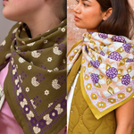 Une association nature et élégante de grands foulards Anastase Olive et Pénélope Myrtille.