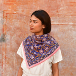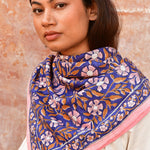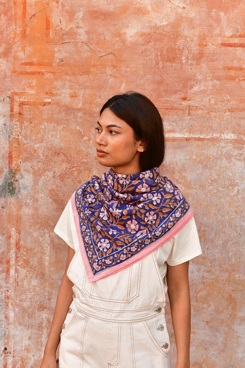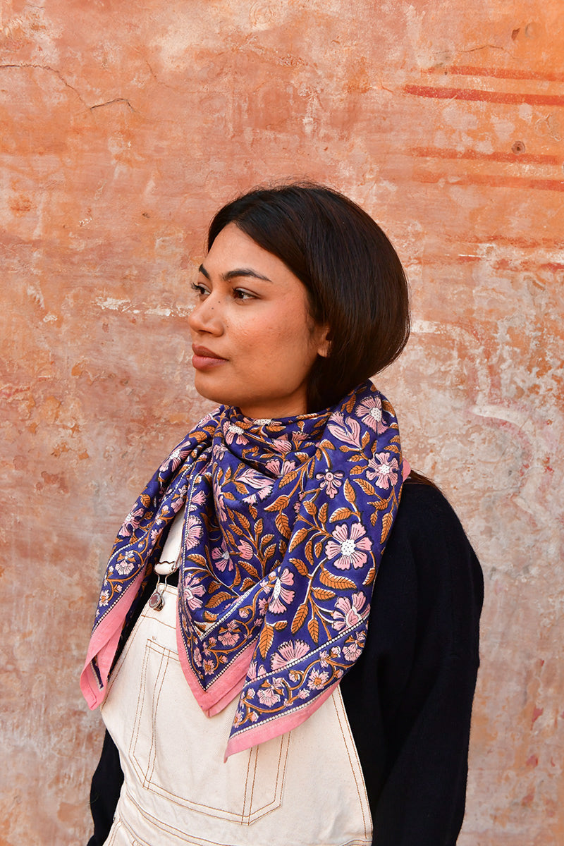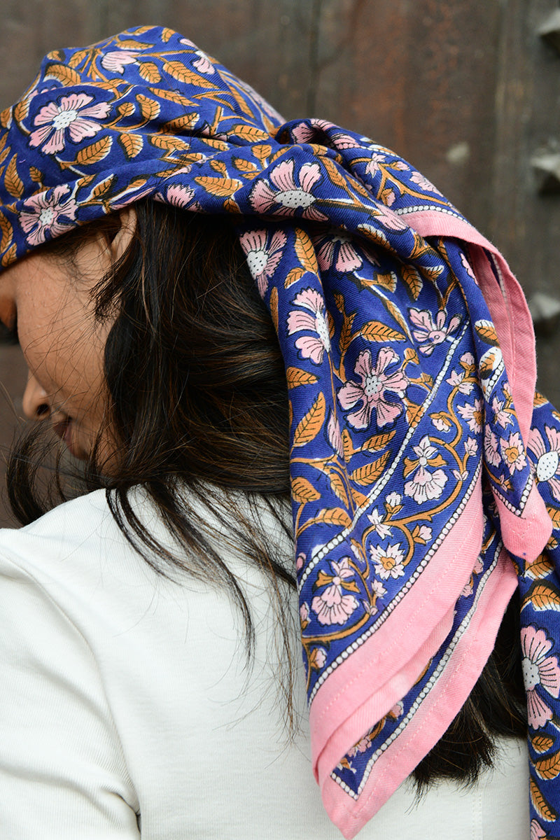 🖐️ Grand foulard imprimé artisanalement dans un atelier du nord de l'Inde, au Rajasthan. L'impression se fait selon le savoir-faire traditionnel de l’impression au block print, avec des tampons de bois taillés et sculptés à la main, trempés dans des encres d’origine végétale et apposés manuellement sur le tissu, en plusieurs couches, avec une maîtrise époustouflante. Des irrégularités d’impression et des nuances de couleurs sont visibles et reflètent la beauté de ce travail artisanal traditionnel. Chaque pièce est donc unique !