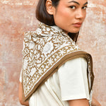 Un foulard bicolore et fleuri facile à porter. Le grand foulard Antioche Kaki, avec ses coloris vert kaki et écru, apportera une légère touche d'originalité à toutes vos tenues.