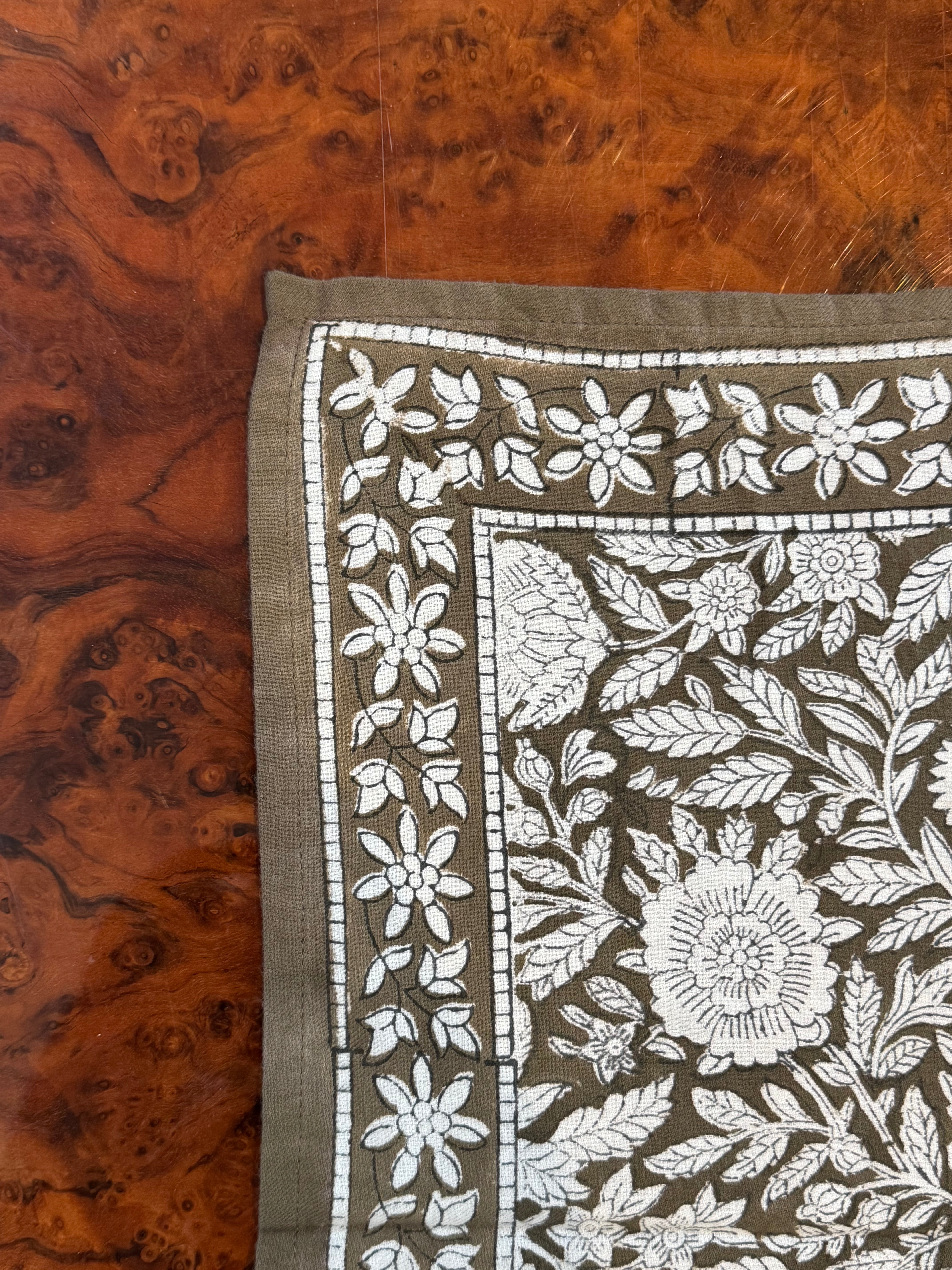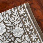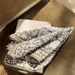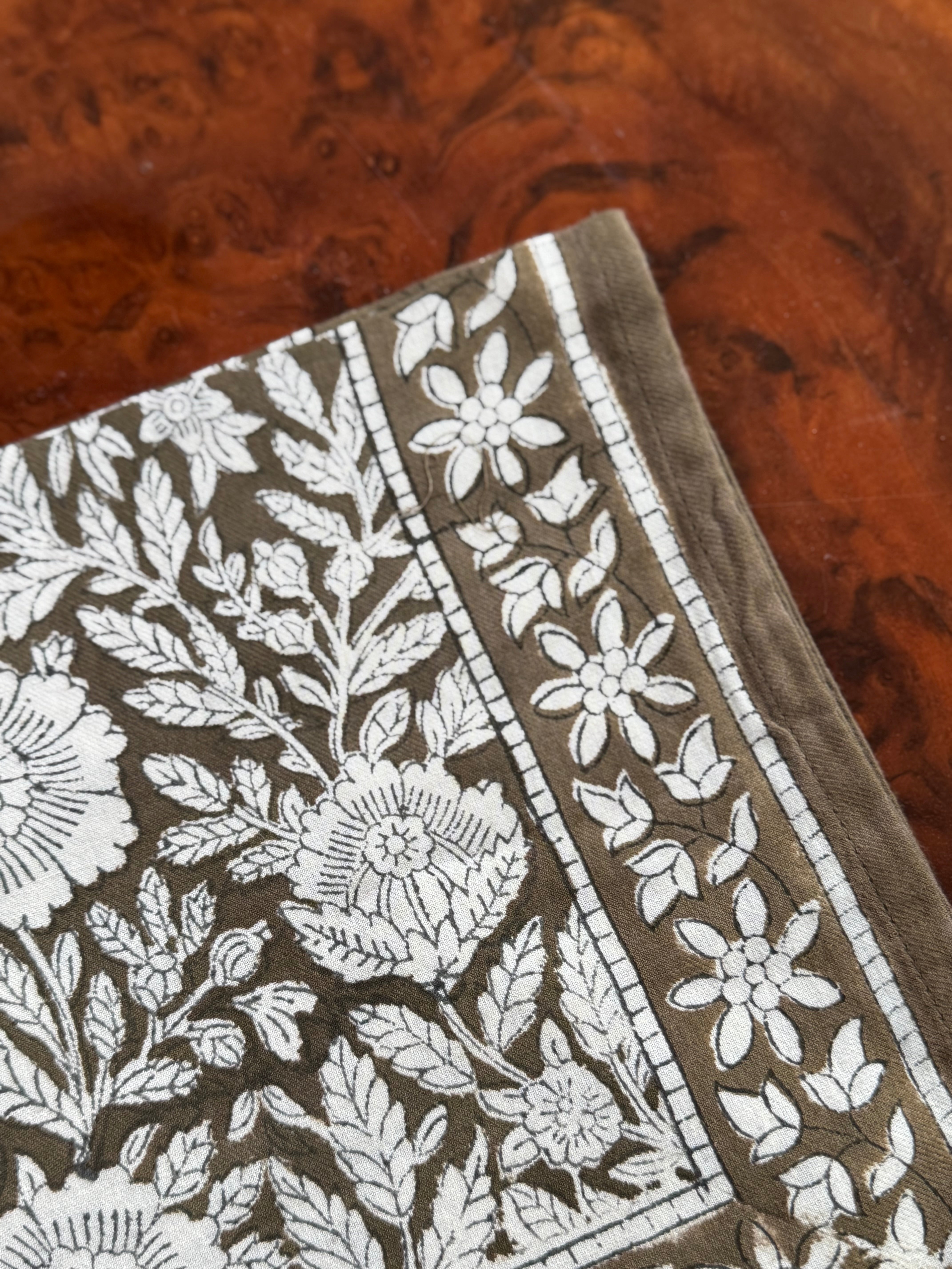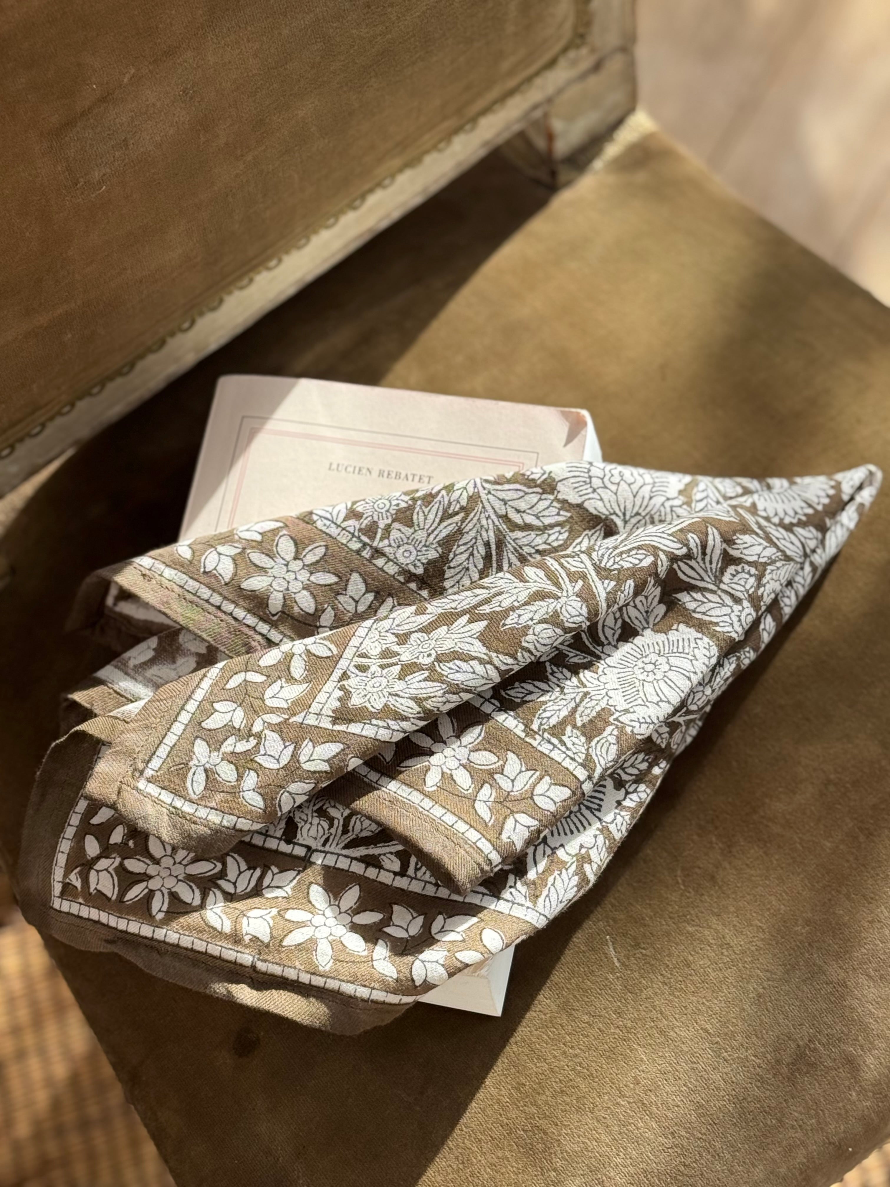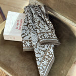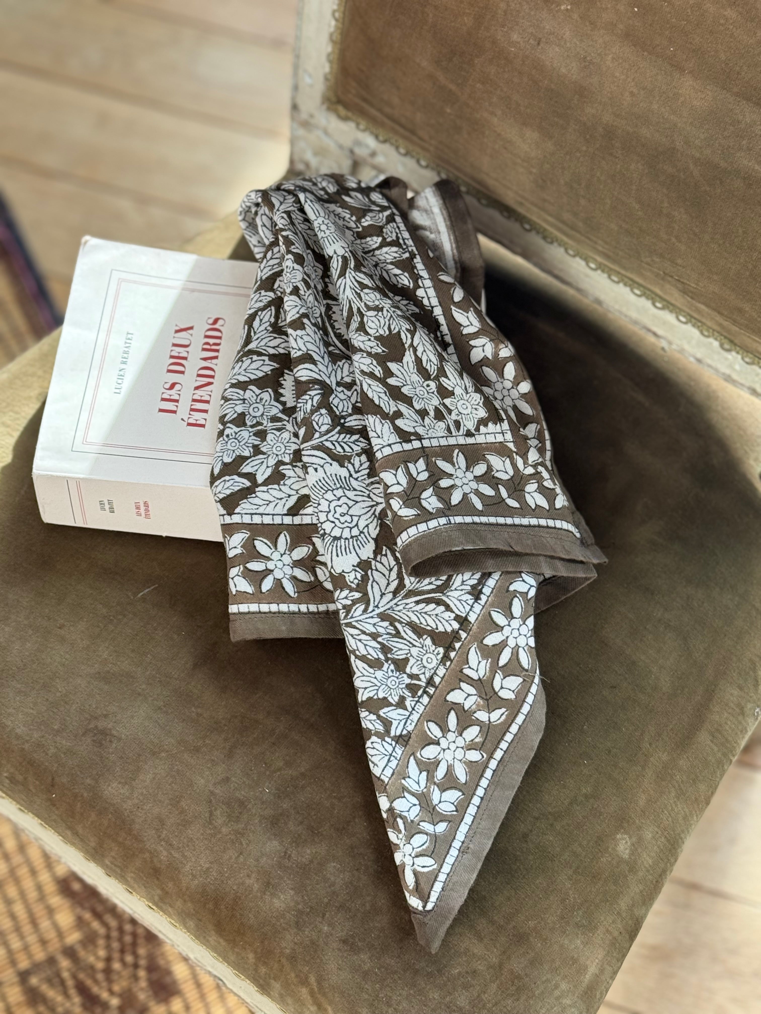 🖐️ Grand foulard imprimé artisanalement dans un atelier du nord de l'Inde, au Rajasthan. L'impression se fait selon le savoir-faire traditionnel de l’impression au block print, avec des tampons de bois taillés et sculptés à la main, trempés dans des encres d’origine végétale et apposés manuellement sur le tissu, en plusieurs couches, avec une maîtrise époustouflante. Des irrégularités d’impression et des nuances de couleurs sont visibles et reflètent la beauté de ce travail artisanal traditionnel. Chaque pièce est donc unique !