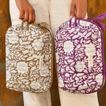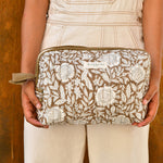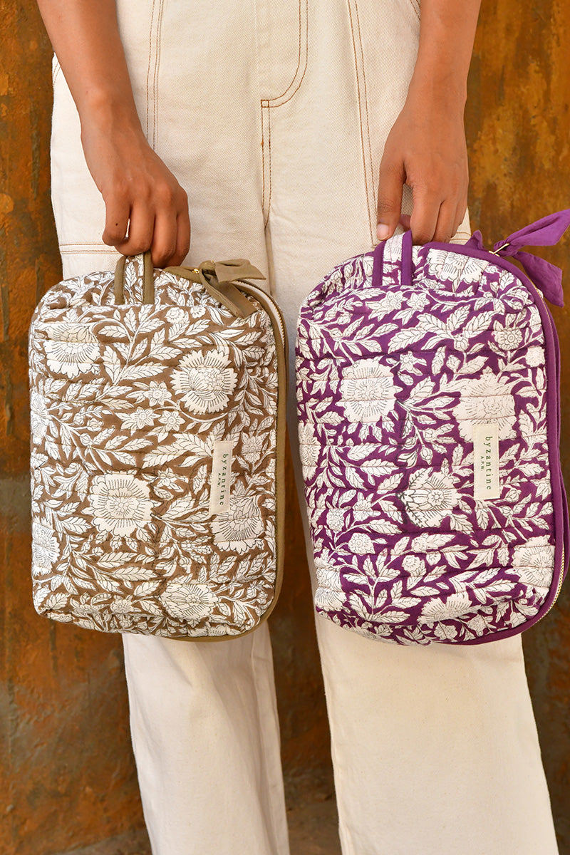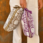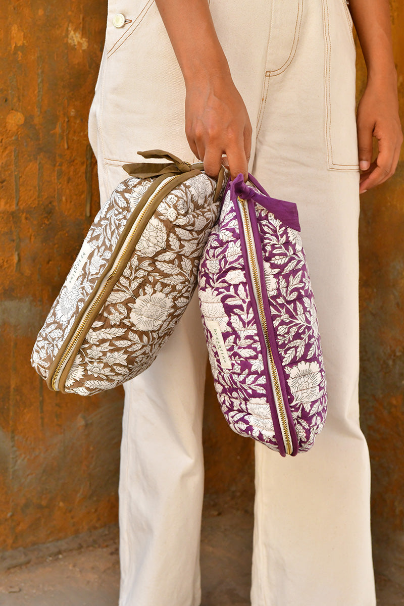 Trousse de toilette confectionnée et imprimée artisanalement dans un atelier du nord de l'Inde, au Rajasthan. Les tissus sont imprimés en Block Print indien, avec des tampons de bois.