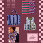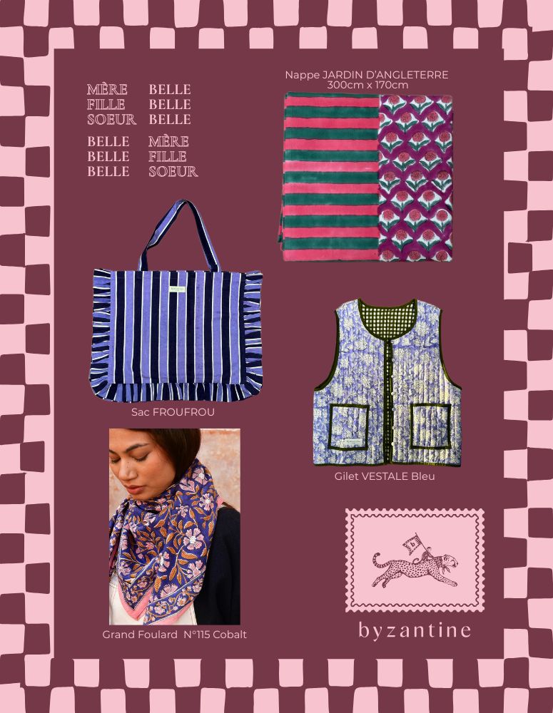 1x Grand Foulard N°115 Cobalt, 1x Gilet Vestale Bleu ciel, 1x Sac Froufrou Lavande, 1x Nappe Jardin d'Angleterre 170x300 cm